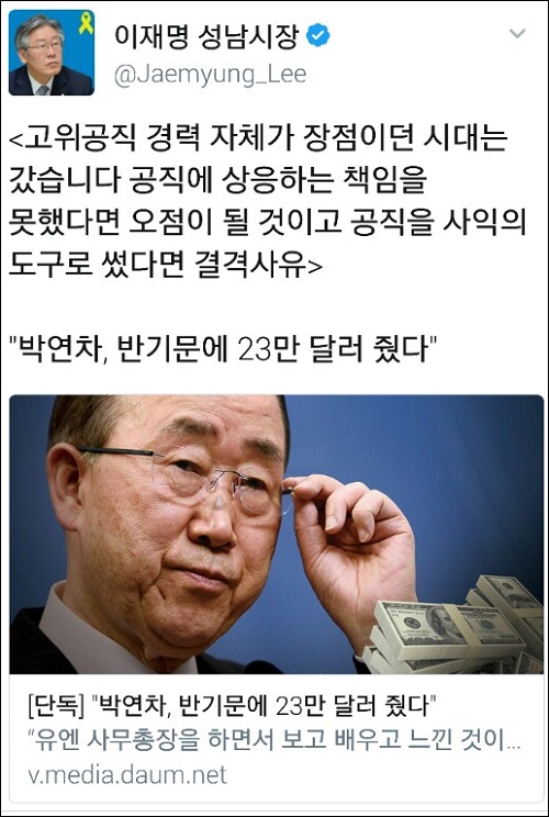 이재명 성남시장은 “고위공직 경력 자체가 장점이던 시대는 갔다”며 “공직에 상응하는 책임을 못했다면 오점이 될 것이고 공직을 사익의 도구로 썼다면 결격사유”라고 지적했다.