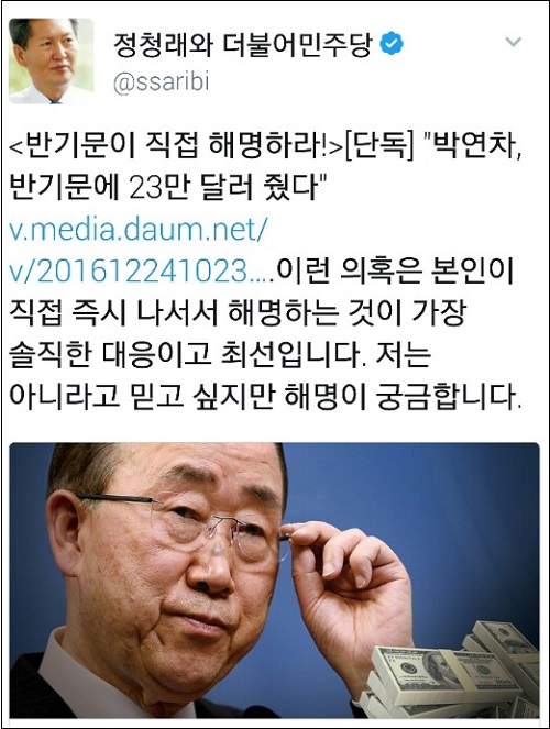 하지만 반기문 총장 측은 이날 해명자료를 내고 “반기문 총장은 공직자 재임 중 어떤 금품도 받은 사실이 없다”며 “10년 동안의 (유엔 사무총장)임기를 마치고 귀국하는 시점에 이 같은 악의적인 보도가 나오는데 깊은 유감”이라고 밝혔다.