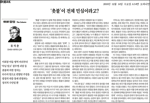 이런 글을 쓴 분들이 반성은커녕 아니 해명조차도 했다는 얘기는 들은 바 없다. 오히려 자신들의 무능과 착오를 가리기라도 하듯 ‘박근혜 때리기’에 함께 열을 올리는 것은 보면 새삼 우리 언론의 하이에나 같은 속성을 절감할 수밖에 없다. 자신들이 반대하던 탄핵소추 결의가 이루어져 한 국면을 넘은 지금 이들 언론은 재차 진영논리에 충실히 복귀한다. 우선 헌법재판소의 결정을 차분히 기다리자며 촛불의 열기를 가라앉히고, 자신들이 보기에 차기 정권을 넘기게 될 야권과 그 대선 주자들에 대한 흠집 잡기에 매진한다. 조선일보는 14일 “촛불은 사기극이고 참가자 수도 뻥튀기”라는 요지의 칼럼을 게재했다. 이 글은 심지어 박근혜 대통령의 비선 국정 개입 의혹까지도 ‘좌파의 음모’로 불거졌다고 우기며 박사모 등의 집회에 모인 “엄청난 숫자”와 중복응답이 가능한 탄핵 관련 사이트의 예를 들어 바닥 민심이 촛불과 다르다고 주장했다. 보고 싶은 것만 보고 듣고 싶은 것만 듣는 일종의 확증 편집증이 어찌도 그리 박근혜 대통령과 닮았을까 싶다.