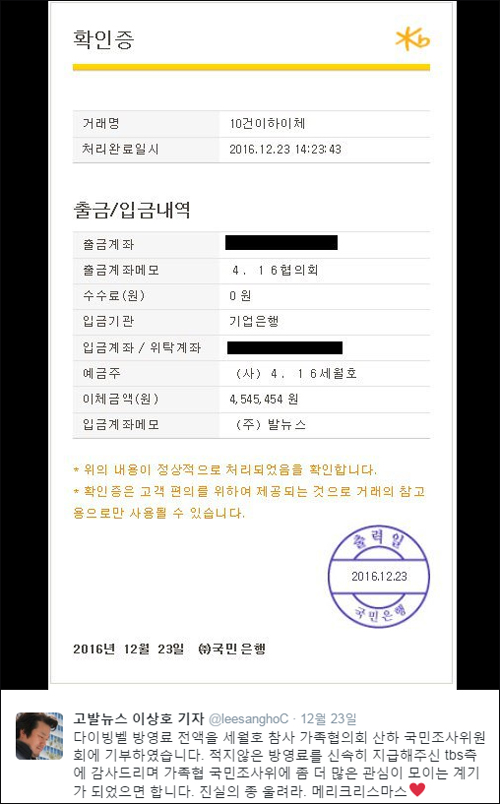 17. 고발뉴스 이상호 기자가 다큐멘터리 영화 '다이빙벨'의 TV 방영료 전액을 세월호 유가족 협회에 기부했습니다. 지난 13일 tbs에서는 한국 방송사 최초로 세월호 참사와 구조 현장에 대한 의혹을 담은 영화 '다이빙벨'을 방영한 바 있습니다.