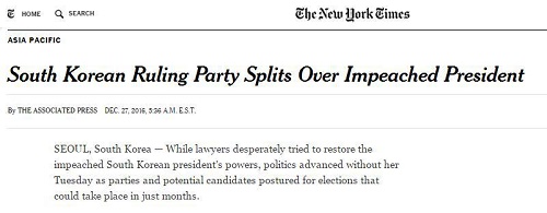 박근혜 탄핵소추 가결 이후 정치권, 특히 집권 새누리당의 세력 재편이 분주하다. 美 뉴욕타임스(NYT)는 AP통신을 받아 한국 정치 상황을 상세히 다뤘다.