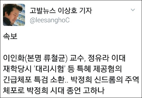 고발뉴스 이상호 기자는 트위터를 통해 류철균 교수 긴급체포 소식을 전하면서 “박정희 신드롬의 주역 체포로 박정희 시대 종언 고하나”라고 지적했다.