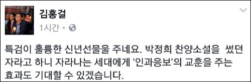 더불어민주당 김홍걸 국민통합위원장도 “특검이 훌륭한 신년선물을 주네요”라며 “박정희 찬양소설을 썼던 자라고 하니 자라나는 세대에게 ‘인과응보’의 교훈을 주는 효과도 기대할 수 있겠습니다”라고 일갈했다.