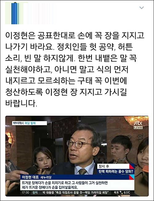 SNS에서는 “이정현씨, 갈 때 가더라도 장은 지지고 가셔야죠”, “이정현 장은 언제 지지나. 탈당하면 다 인가. 의원직도 내놓으시길”, “손에 장은 지지고 탈당해야지. 일구이언 하면 안되고 남아 일언 중천금인데 그냥 가면 남자가 아니다”, “이정현, 갈 때 가더라도 손에 장 지지고 가라”, “이정현은 탈당 전에 할 일이 있다. 좌우지 장지지지지, 좌우지 장지지지지”, “이정현은 공표한대로 손에 꼭 장을 지지고 나가기 바라요”, “나도 이정현 탈당 여부보다 장 지지는 게 훨씬 더 중요한 사안이라고 생각” 등의 의견이 이어졌다.
