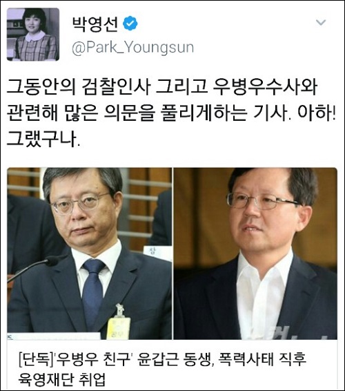민주당 박영선 의원도 자신의 SNS에 해당 기사를 공유하고는 “그동안의 검찰인사 그리고 우병우 수사와 관련해 많은 의문을 풀리게 하는 기사. 아하! 그랬구나”라고 적었다.