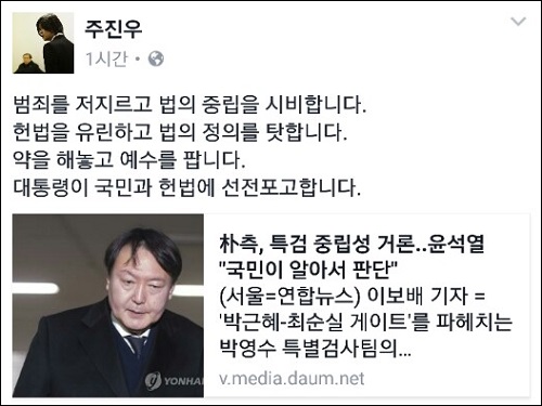 박 대통령 측의 이 같은 발언에 대해 <시사인> 주진우 기자는 자신의 SNS에 “범죄를 저지르고 법의 중립을 시비한다. 헌법을 유린하고 법의 정의를 탓한다. 약을 해놓고 예수를 판다. 대통령이 국민과 헌법에 선전 포고한다”고 적었다.