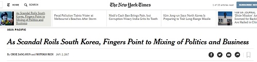 새해 전야에도 박근혜의 즉각적인 퇴진을 요구하는 시위가 이어져 외신들의 주목을 받은 가운데 뉴욕 타임스는 2일 박최 게이트의 핵심이 한국 사회의 뿌리 깊은 ‘정경유착’이라고 꼬집는 분석 기사를 내놨다.