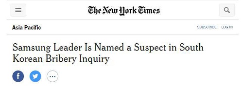 뉴욕타임스는 11일 ‘Samsung Leader Is Named a Suspect in South Korean Bribery Inquiry-한국 삼성 이재용 부회장, 뇌물 혐의에서 피의자로 지명’이라는 제목의 기사에서 삼성의 실제 1인자인 이 부회장이 박근혜가 최순실과 공모한 혐의를 받고 있는 뇌물죄의 피의자로 목요일 특검에 출두하게 될 것이라고 전했다.