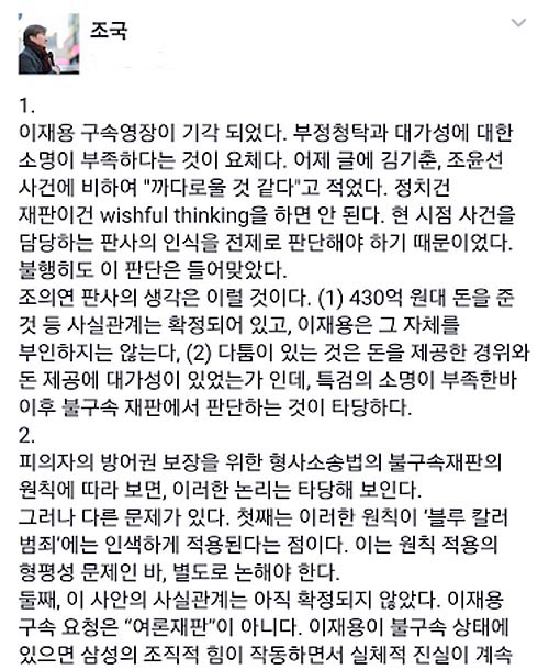 조국 서울대 법학전문대학원 교수는 19일 법원의 이재용 삼성전자 부회장 구속영장 기각 결정과 관련해 “특검은 기죽지 말아야 한다”며 “더욱 가열차게 해나가야 한다”고 말했다.