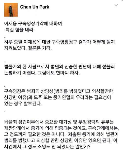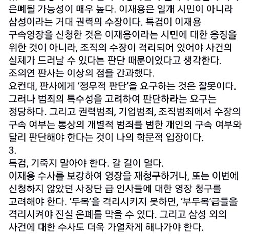 그러면서 박 교수는 “특검이 잘 판단하겠지만, 이재용에 대한 구속영장기각을 받아들일 수 없다면, 증거를 보강해 다시 영장청구를 해야 할 것”이라고 견해를 밝혔다.
