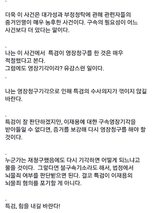 그는 “결코 특검이 이재용의 뇌물죄 혐의를 포기할 게 아니다”며 “특검, 힘을 내길 바란다”고 했다.