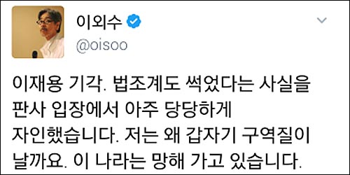 소설가 이외수씨는 19일 조의연 부장판사의 이재용 삼성전자 부회장 구속영장 기각에 대해 “법조계도 썩었다는 사실을 판사 입장에서 아주 당당하게 자인했다”고 비판했다.