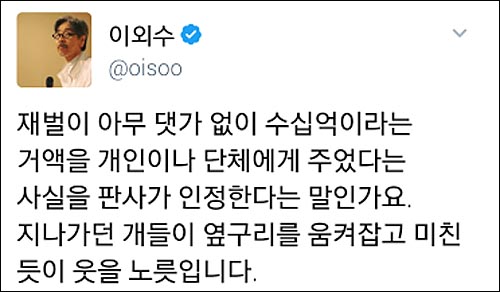 이 씨는 “재벌이 아무 대가 없이 수십억이라는 거액을 개인이나 단체에게 주었다는 사실을 판사가 인정한다는 말인가”라며 “지나가던 개들이 옆구리를 움켜잡고 미친 듯이 웃을 노릇”이라고 성토했다.