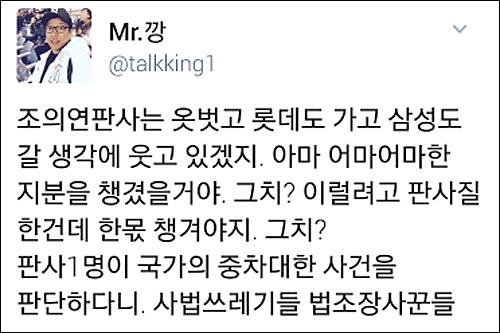 강 씨는 “조 판사는 옷 벗고 롯데도 가고 삼성도 갈 생각에 웃고 있겠지”라며 “아마 어마어마한 지분을 챙겼을 거야. 그치?”라고 비꼬았다.