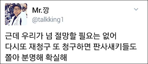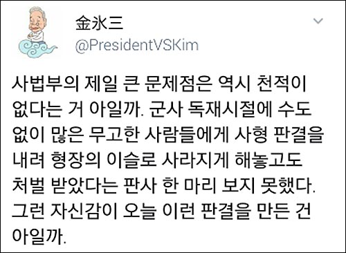 아울러 그는 “사법부의 제일 큰 문제점은 역시 천적이 없다는 거 아일까”라며 “군사 독재시절에 수도 없이 많은 무고한 사람들에게 사형 판결을 내려 형장의 이슬로 사라지게 해놓고도 처벌 받았다는 판사 한 마리 보지 못했다”고 ‘반성 없는 사법부’의 역사를 끄집어냈다.
