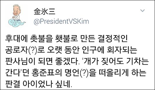 파워트위터러 김빙삼(金氷三 @PresidentVSKim)은 “후대에 촛불을 횃불로 만든 결정적인 공로자(?)로 오랫동안 인구에 회자되는 판사님이 되면 좋겠다”고 힐난했다.