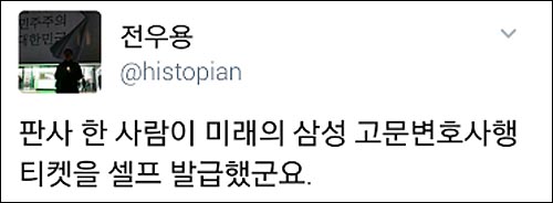 전우용 역사학자는 “판사 한 사람이 미래의 삼성 고문변호사행 티켓을 셀프 발급했군요”라고 비꼬았다.