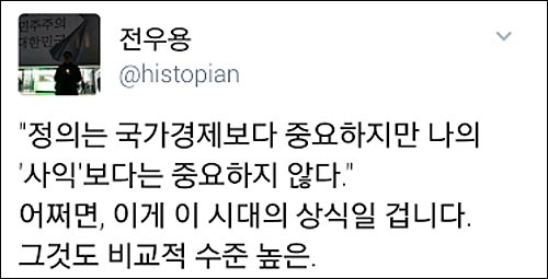 그러면서 전 학자는 “정의는 국가경제보다 중요하지만 나의 ‘사익’보다는 중요하지 않다, 어쩌면, 이게 이 시대의 상식일 겁니다. 그것도 비교적 수준 높은”라고 재벌과 법조계의 속내를 꼬집었다.