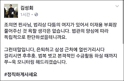 손혜원 더불어민주당 의원의 김성회 보좌관은 “조의연 판사님. 은퇴하고 삼성 근처에 얼씬거리시다 걸리시면 후후훗”라고 경고했다. 그는 “법복 벗고 본격적인 수금활동 하실 때까지 쭈~욱 모니터링 해드리겠습니다”라고 밝혔다.
