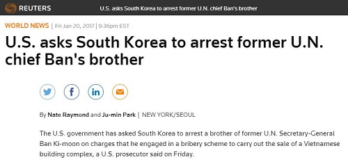 반기문 전 유엔 사무총장이 퇴임 직후 연일 대선 행보를 하고 있는 상황에서, 로이터는 반 전 총장의 동생 반기상 씨가 뇌물 수수 관련 혐의로 미 검찰이 한국 정부에 반기상 씨의 체포를 요청했다고 보도했다.