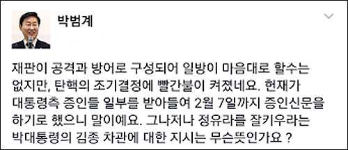 또 재판 상황과 관련 박 의원은 “재판이 공격과 방어로 구성되어 일방이 마음대로 할 수는 없지만, 탄핵의 조기결정에 빨간불이 켜졌다”며 “헌재가 대통령측 증인들 일부를 받아들여 2월 7일까지 증인신문을 하기로 했다”고 말했다.