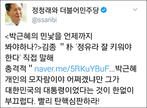 정청래 전 민주당 의원은 “박근혜의 민낯을 언제까지 봐야 하나”라며 “박근혜 개인의 모자람이야 어쩌겠냐만 그가 대한민국의 대통령이었다는 것이 한없이 부끄럽다. 빨리 탄핵심판하라”고 촉구했다.