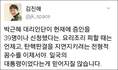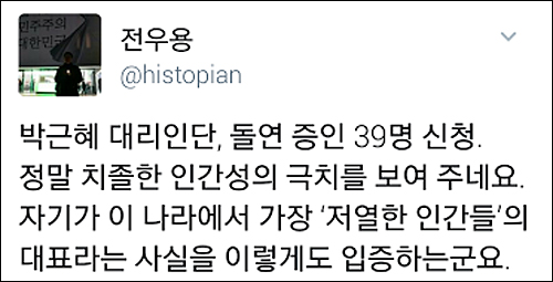 박 대통령측의 노골적인 지연 전략에 대해 역사학자 전우용 한양대 동아시아문제연구소 교수는 “정말 치졸한 인간성의 극치를 보여 준다”고 성토했다.
