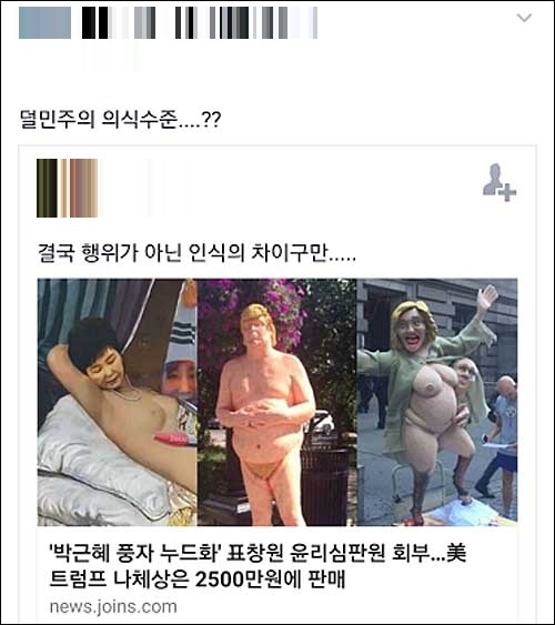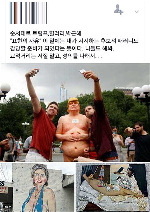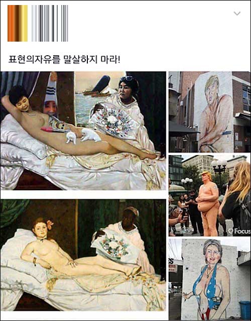 목씨는 “광화문에 등장했던 단두대가 촛불 든 시민들의 심정을 단도직입적으로 표현한 것이었다면, 국가권력에 의해 손발이 묶였던 예술가들은, 태극기 속에 들어가 있는 최순실, 박정희가 담긴 부채로 치부를 가린 벌거벗은 박근혜로 그들의 분노를 표현한다”며 “도대체 무엇이 잘못인가?”라고 해당 그림을 옹호했다.