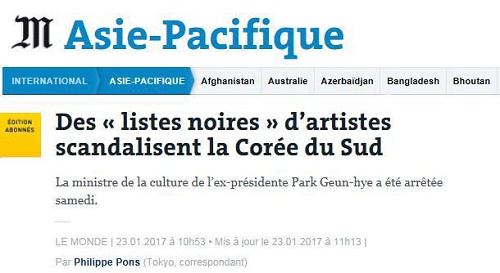 필립 퐁스 도쿄 특파원은 23일 인터넷판에 “한국을 분노에 빠뜨린 예술가 ‘블랙 리스트’”라는 제목의 기사를 싣고 지난 주말 현직이던 조윤선 문체부 장관과 김기춘 전 대통령 비서실장이 구속됐다고 전했다.