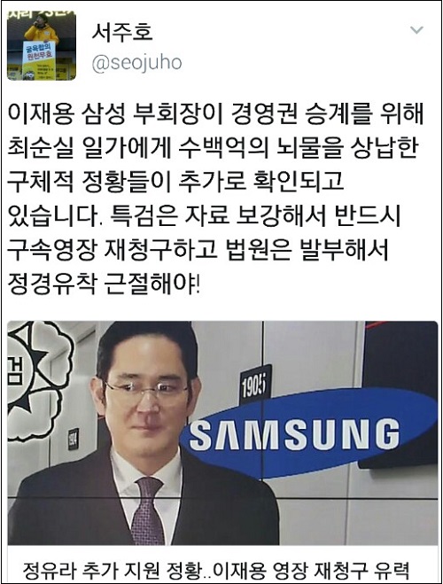 서주호 정의당 서울시당 사무처장은 “이재용 삼성 부회장이 경영권 승계를 위해 최순실 일가에게 수백억의 뇌물을 상납한 구체적 정황들이 추가로 확인되고 있다”며 “특검은 자료 보강해서 반드시 구속영장 재청구하고 법원은 발부해서 정경유착 근절해야(한다)”고 촉구했다.
