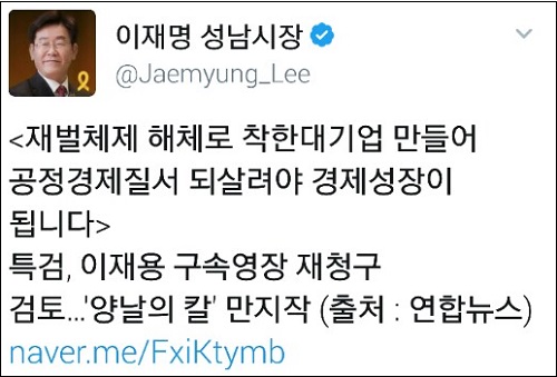 이재명 성남시장도 특검의 이재용 구속영장 재청구 검토 관련 기사를 자신의 SNS에 공유하며 “재벌체제 해체로 착한대기업 만들어 공정경제질서 되살려야 경제성장이 된다”고 강조했다.