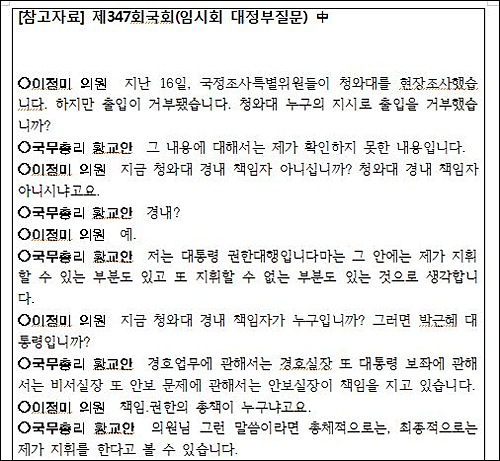 이 의원은 “특검수사가 곧 시작된다”며 “청와대 경내 총괄책임자는 총리라고 답변했는데 경호실에 압수수색 받으라고 지시해야 한다, 지시하겠는가”라고 물었다.