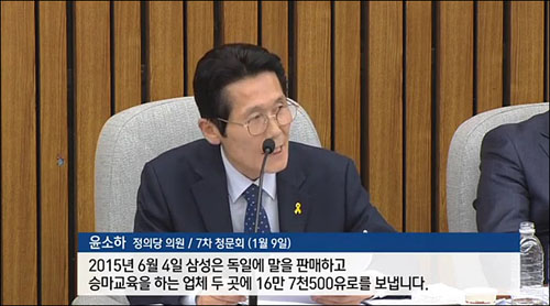 윤 의원은 “그리고 2015년 6월11일 페덴 블러드스톡(말 운송업체)에 다시 2만 8천970유로를 보낸다”며 “갑자기 말을 사는 시기와 삼성전자‧제일모직 합병 시기가 묘하게 겹친다”고 지적했다.
