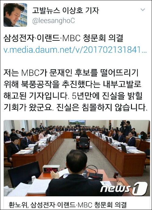 이상호 기자는 트위터에 “저는 MBC가 문재인 후보를 떨어뜨리기 위해 북풍공작을 추진했다는 내부고발로 해고된 기자”라며 “5년 만에 진실을 밝힐 기회가 왔군요. 진실은 침몰하지 않습니다”라고 적었다.