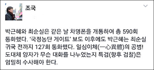 이에 대해 조국 서울대 법학전문대학원 교수는 SNS에서 “일심이체(一心異體)의 공범”이라며 “도대체 양자가 무슨 대화를 나누었는지 특검(향후 검찰)은 엄밀히 수사해야 한다”고 촉구했다.