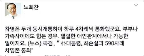 노회찬 정의당 원내대표는 “차명폰 두개 동시개통하여 하루 4차례씩 통화했군요”라며 “부부나 가족 사이에도 힘든 경우. 열렬한 애인관계에서나 가능한 일”이라고 꼬집었다.