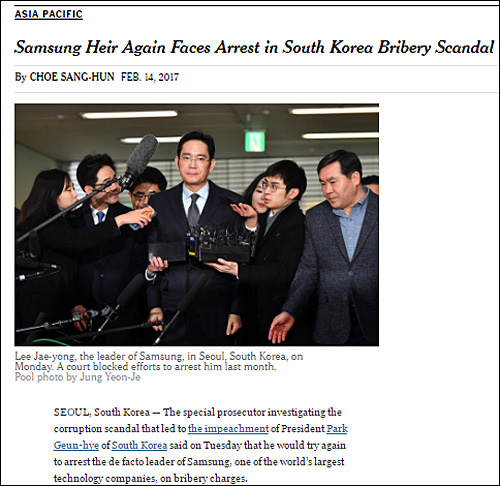 뉴욕타임스는 14일 ‘Samsung Heir Again Faces Arrest in South Korea Bribery Scandal- 뇌물죄로 삼성 후계자 구속 재청구’라는 제목으로 ‘ 한국 박근혜 대통령의 탄핵을 이끈 부패 스캔들을 수사 중인 특별검사는 화요일, 세계 제1의 테크놀러지 기업 중 하나인 삼성의 사실상의 우두머리인 이재용에 대한 뇌물죄 혐의 구속을 재시도하겠다고 밝혔다’고 전했다.