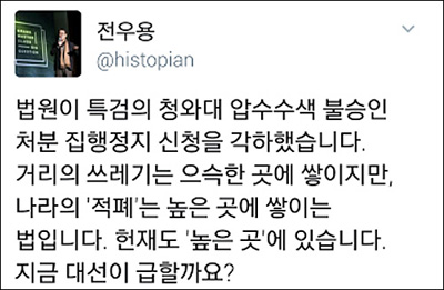 전우용 역사학자는 “거리의 쓰레기는 으슥한 곳에 쌓이지만, 나라의 ‘적폐’는 높은 곳에 쌓이는 법”이라며 “헌재도 ‘높은 곳’에 있다”고 일침을 날렸다. 이어 그는 “지금 대선이 급할까요?”라고 정치권을 비판했다.