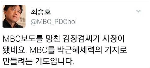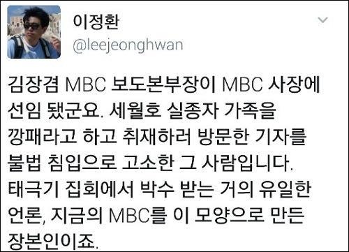 이정환 <미디어오늘> 사장은 “김장겸 MBC 보도본부장이 MBC 사장에 선임됐다”고 전하며 “세월호 실종자 가족을 ‘깡패’라고 하고, 취재하러 방문한 기자를 불법 침입으로 고소한 그 사람이다. 태극기 집회에서 박수 받는 거의 유일한 언론, 지금의 MBC를 이 모양으로 만든 장본인”이라고 성토했다.