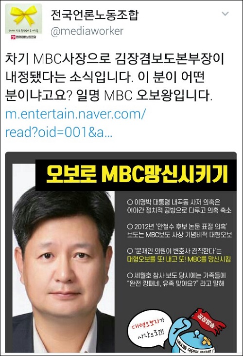 MBC 김장겸 보도본부장이 신임 사장에 선임 됐다. 이에 전국언론노조 MBC본부는 “김재철‧안광한 사장 체제에서 MBC 뉴스를 파탄으로 몰아넣은 총책임자”라며 강력 반발하고 나섰다.
