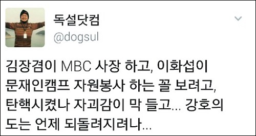 <시사인> 고재열 기자는 “김장겸이 MBC 사장 하고, 이화섭(前 KBS 보도본부장)이 문재인 캠프 자원봉사 하는 꼴 보려고, 탄핵시켰나 자괴감이 막 들고.. 강호의 도는 언제 되돌려지려나”라고 개탄했다.