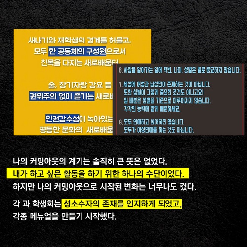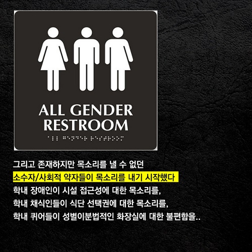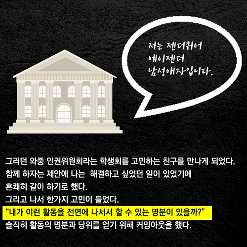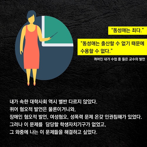 | “인권은 그 누구만을 위한 것이 아니다” 동그리(대학성소수자모임연대 QUV) 이 글을 쓰기 전, “인권, 인권이 존재하기 위해 먼저 선결되어야 하는 것은 무엇일까?”를 고민해본다. 우리의 역사 속에서 봤을 때, 인권은 늘 그 대상의 존재를 인식하는 여부와 함께 확장하고 변화하고 발전해왔다. (물론 이는 선결, 앞뒤의 문제가 아닌 동반자적인 입장이겠다.) 하지만 성소수자 인권을 원하지 않는 사람들이 세상에 너무 많다. 왜 원하지 않는 것일까? 이를 위해 성소수자의 존재를 끊임없이 지우려는 사람들이 있다. 그것은 한국 사회가 그렇고 내가 현재 활동하고 있는 대학사회도 마찬가지이다. 한국 사회 속에 대학 사회가 있는 것이니 당연한 현상이겠지만, 나는 내가 속해있고 접근성이 높은 대학사회에 대해 이야기를 해보고자 한다. 내가 속해 있는 “대학성소수자모임연대 QUV”(이하 큐브)는 2013년 차별금지법 제정과 대학 내의 성소수자 인권 또한 우리 사회의 인권지수와 무관할 수 없다는 인식을 공유하면서 2014년에 만들어진 연대체이다. 이곳은 2016.12.31 기준으로 전국 54개 대학, 59개모임이 모여있다. 이처럼 대학사회는 상대적으로 성소수자에 친화적이고 함께 할 수 있는 공간일 수 있겠다. 하지만 성소수자모임이 많은 만큼, 어떤 경우에 따라 가시화가 되어 있다보니 그 만큼의 반동과 혐오, 탄압이 일어나고 있는 곳이기도 하다. 몇 가지 예를 들자면, 서강대학교의 경우는 학내 성소수자모임인 ‘춤추는 Q’에서 신입학시즌에 게시한 성소수자 신입생을 환영한다는 현수막을 교수가 임의대로 철거한 사례가 있었다. 학내에서 게시를 하기 위해 필요한 모든 행정정차를 다 거쳤음에도 불구하고 말이다. 해결하는 과정에서 교수는 ‘서강대 학우는 비성소수자들도 있는데, 성소수자 입학생만 축하하는 것이냐 그러면 안된다.’는 말과, 원래 지저분한 것을 잘 떼는 사람이라는 말도 안되는 핑계를 되기도 하였다. 이에 학생 사회에서 각 학생회가 규탄 서명을 내고 고소장을 접수 하는 등의 대응을 진행하기도 했다. 보수 기독교 교단의 대학인 총신대의 경우는 더욱 심하다. 총신대의 경우, 퀴어문화축제에 본 대학모임인 깡충깡충을 색출해 내겠다는 이유로 축제 당일 학교본부와 교단 소속 목사를 퀴어문화축제 행사장에 보내기도 하였다. 또한 퀴어퍼레이드를 하는데 깡충깡충 구성원들의 신원노출을 우려해 대신 깃발을 들었던 사람을 학교에서 고소를 하기도 하였다. 기본적으로 반동성애 운동을 하는 기독교이기에 채플시간에 혐오발언은 물론 교수들의 혐오발언도 매우 심한 곳이기도 하다. 몇몇 사례일 뿐, 대학이라는 공간의 혐오는 어느때보다 짙고, 반동은 어느 때보다 심하다. 숭실대는 인권영화제에 성소수자 관련 영화를 상영한다는 이유로 대관거절, 고려대도 마찬가지며, 성소수자의 존재를 대학 사회에서 끊임없이 지우려하고 지움당하고 있다 하지만 작년 김보미 서울대 총학생회장, 고려대 동아리연합회장를 시작으로 연세대 총여학생회장, 카이스트 부총학생회장, 계원예대 총학생회장이 생겨났고, 뿐만 아니라 학생사회에서 끊임 없이 커밍아웃을 하고 학생 사회의 활동을 이어나가는 것일까? 왜일까? 이런 대학사회 내 탄압 속에서도 성소수자 인권운동을 하고 있으며, 선출직은 아니지만 커밍아웃을 한 채, 인권위원회라는 학생사회 내 기구에서 활동하고 있는 나의 이야기를 통해 풀어내고자 한다. 내가 있는 학교는 그렇게 성소수자를 비롯한 혐오가 가시적으로 팽배한 공간은 아니다. 하지만 교수님들의 입에서 “동성애는 출산을 할 수 없기에 수용할 수 없다.”, “동성애는 죄다.” 라는 말들이 간간히 나오고 있는 공간이다. 내가 성소수자임을 커밍아웃하고 활동을 결심하게 된 것 역시, 교수님들의 동성애 혐오적인 말들이 결정적인 계기가 되었다. 친구들 사이에서도 여자/남자친구에 대한 물음은 물론, 이성애중심적인 발언이 나오고 그 과정에서 나의 존재가 지워지는 것이 답답했다. 또한 학내에서 각종 문제시 되는 인권침해적 상황, 그리고 발언들이 비일비재하지만 아무도 제약하거나 조정할 수 없었던 상황이 있었다. 그 당시에는 인권위원회라는 기구도 없었고, 총학생회 역시 부재의 상황이었기 때문이다. 그러다보니, 나는 이 상황에 있어 몹시 못마땅 하였고 이를 해결하고 싶었다. 그 과정에서 여러 사람들을 모으고 정책과 상을 구상하고 있었는데 그러다가 오는 것은 “내가 이것을 할 수 있는 명분이 있는가?”였다. 그래서 내가 인권을 말할 수 있는 최소한의 당사자임을 보여주기 위해 커밍아웃을 했고, 학생 대표자들의 인준을 통해 학생회를 할 수 있었다. 학생회를 하면서 학생 사회는 많이 변했다. 각 과에서 성소수자의 존재를 보다 가시적으로 인식하게 되었고, 그에 따른 교육들을 각과가 자생적으로 만들어내기 시작하였다. 그리고 기존에 말하지 못하던, 소수자들이 말하기 시작했다. 장애인도 장애인권 소모임이 만들어지고 운영되고 있고, 채식인들의 인권 역시 활발하게 교류되고 있는 것을 볼 수 있었다. 이로서 나의 커밍아웃은 완성되었다.