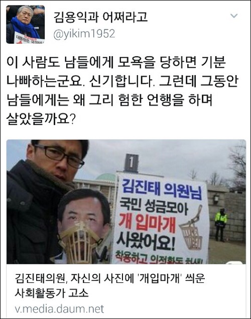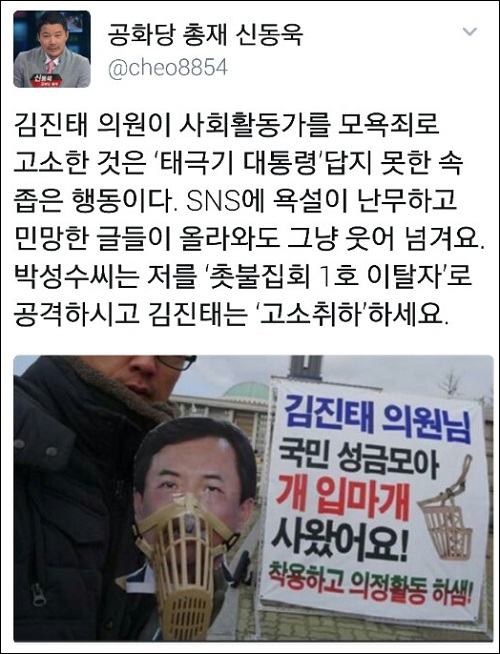 박근혜 대통령의 제부 공화당 신동욱 총재도 트위터에 “김진태 의원이 사회활동가를 모욕죄로 고소한 것은 ‘태극기 대통령’ 답지 못한 속 좁은 행동”이라고 적었다.