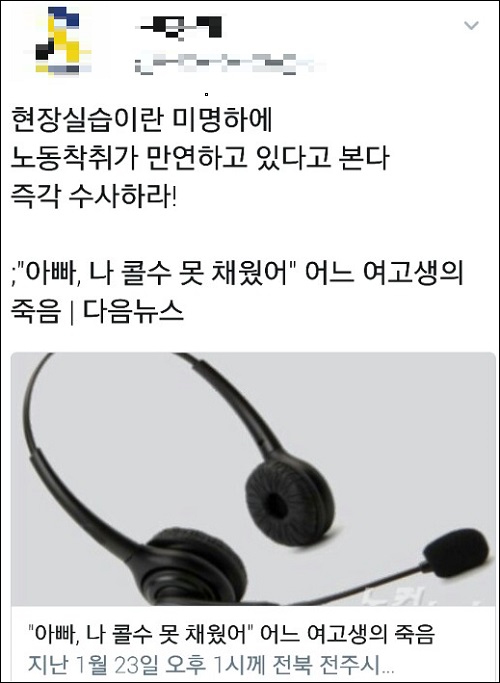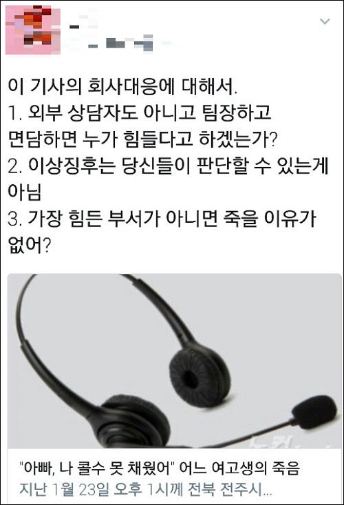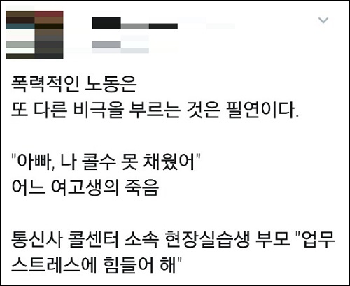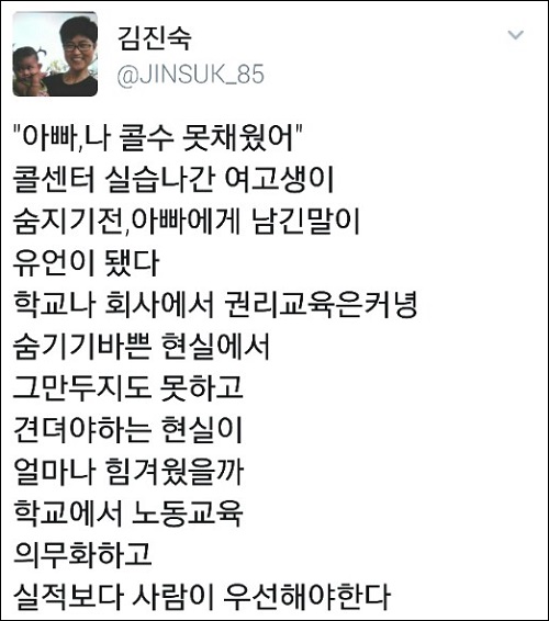 한편, 민주노총 부산본부 김진숙 지도위원은 트위터를 통해 “‘아빠, 나 콜 수 못채웠어’, 콜센터 실습나간 여고생이 숨지기 전, 아빠에게 남긴 말이 유언이 됐다”며 안타까운 마음을 토로했다.