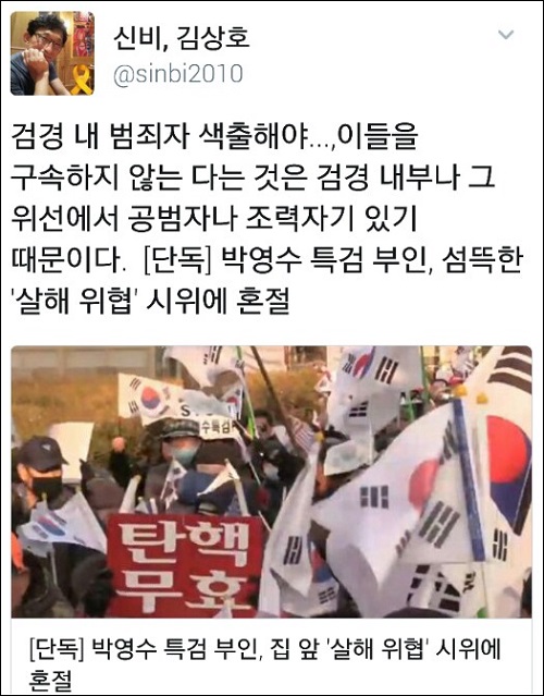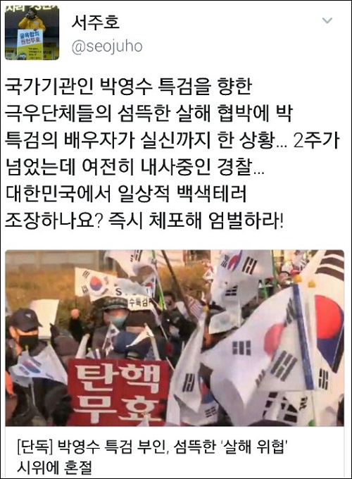 서주호 정의당 서울시당 사무처장은 SNS를 통해 “국가기관인 박영수 특검을 향한 극우단체들의 섬뜩한 살해 협박에 박 특검의 배우자가 실신까지 한 상황.. 2주가 넘었는데 여전히 내사중인 경찰.. 대한민국에서 일상적 백색테러 조장하나요? 즉시 체포해 엄벌하라”고 목소리를 높였다.
