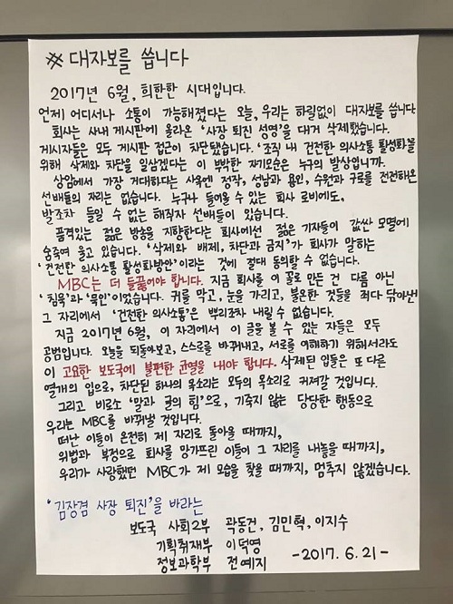 MBC 막내기자들이 동영상 반성문에 이어 이번에는 회사 곳곳에 대자보를 걸고 사내 구성원들에게 ‘김장겸 퇴진’을 위해 함께 목소리를 내줄 것을 호소했다.