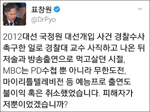 그는 또다른 글을 통해 “2012 국정원 대선개입 사건 경찰수사 촉구한 일로 경찰대 교수 사직하고 나온 뒤 저술과 방송출연으로 먹고살던 시절, MBC는 PD수첩 뿐 아니라 무한도전, 마이리틀텔레비전 등 예능프로 출연도 불이익 혹은 취소했었다”며 “피해자가 저뿐이었겠나”라고 꼬집었다.