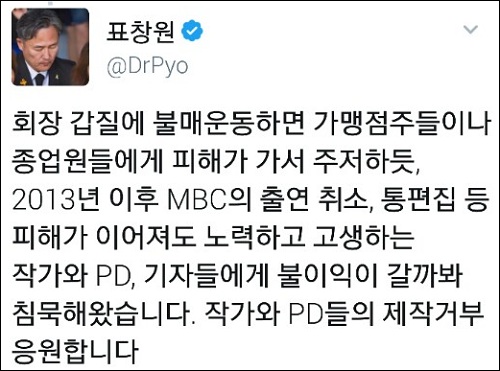 그런가하면 더불어민주당 표창원 의원은 “회장 갑질에 불매운동하면 가맹점주들이나 종업원들에게 피해가 가서 주저하듯, 2013년 이후 MBC의 출연 취소, 통편집 등 피해가 이어져도 노력하고 고생하는 작가와 PD, 기자들에게 불이익이 갈까봐 침묵해왔다”고 밝히며 “작가와 PD들의 제작거부 응원한다”고 전했다.