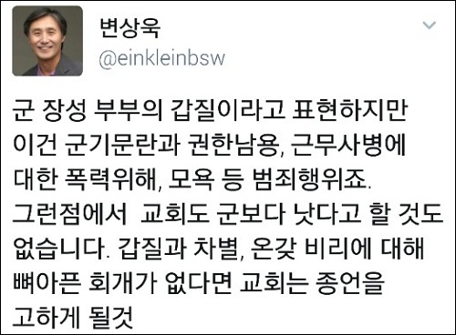 CBS 변상욱 대기자도 “군 장성 부부의 갑질이라고 표현하지만 이건 군기문란과 권한남용, 근무사병에 대한 폭력위해, 모욕 등 범죄행위”라고 지적했다.