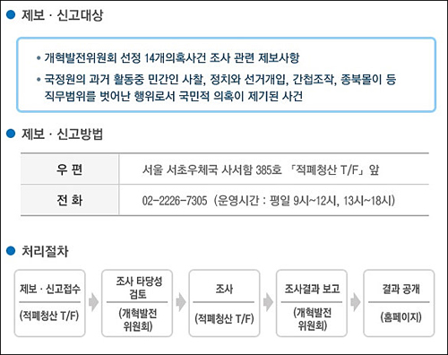 국정원 개혁발전위는 홈페이지에 ‘적페청산TF 운영안내’를 개설하고 적폐청산TF가 선정한 14개 사건과 관련해 시민들의 제보를 받고 있다.